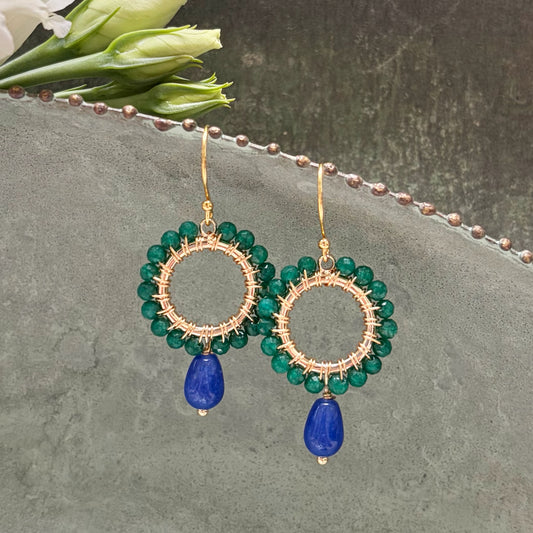 Apple Green Jade Mini Round With Royal Blue Agate Drop Beaded Earrings