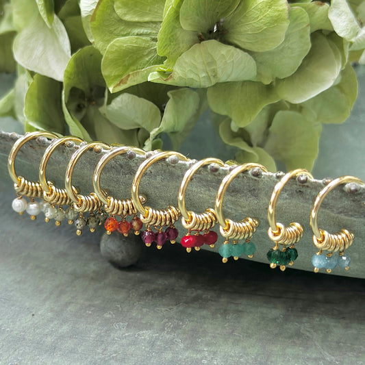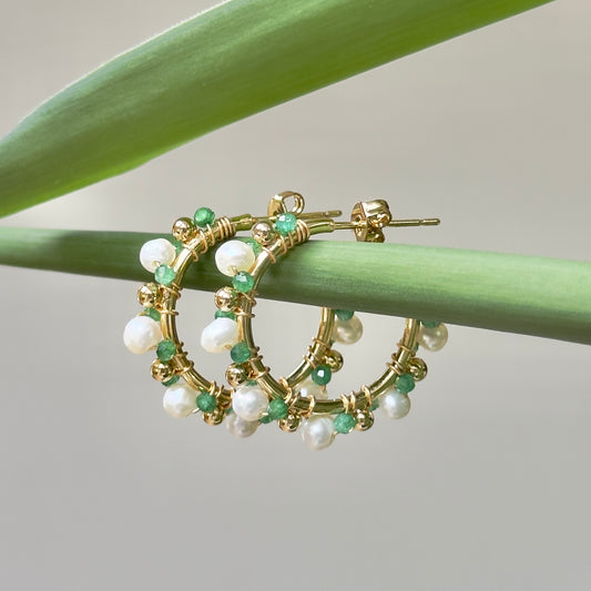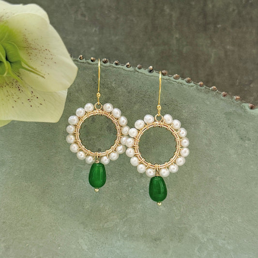 Pearl & Green Jade Mini Bobble Hoop Beaded Earrings