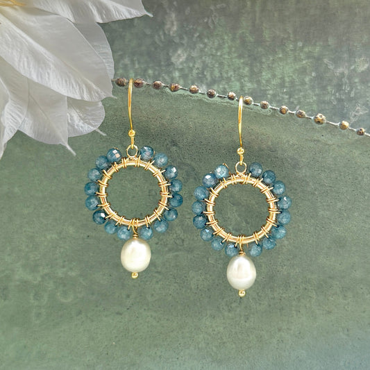*Mini Hoop Earrings With Ibiza Pearl & Dark Cornflower Blue Kyanite Drops
