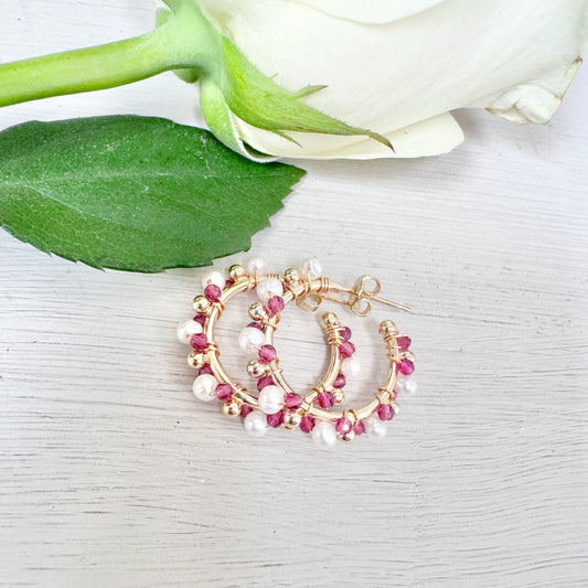 Pearl & Fuchsia Pink Garnet Mini Bobble Hoop Beaded Earrings