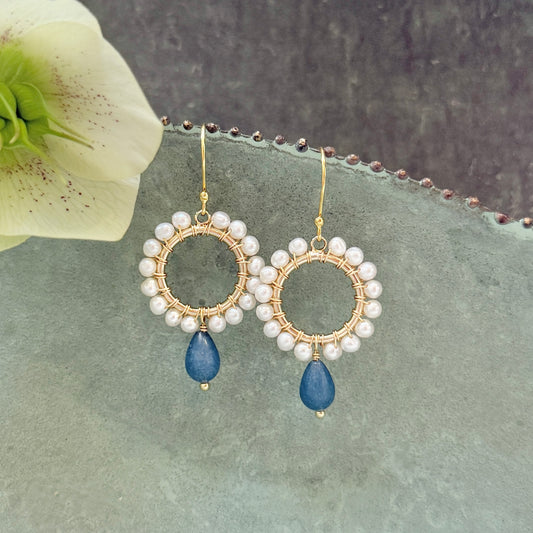 Pearl Mini Round With Dark Denim Chalcedony Drop Beaded Earrings