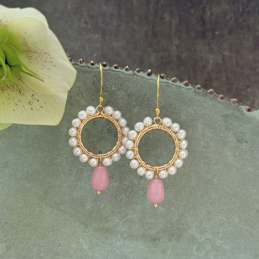Pearl Mini Round With Pale Pink Chalcedony Drop Beaded Earrings