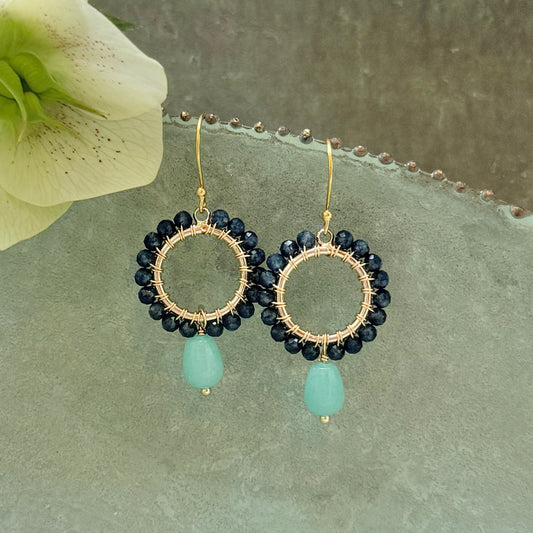 Dark Denim Iolite Mini Round With Seafoam Chalcedony Drop Beaded Earrings