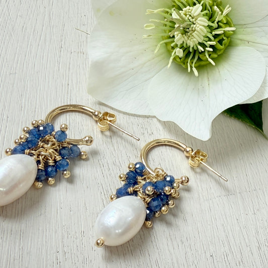 Mini Hoop Earrings With Ibiza Pearl & Dark Denim Blue Iolite Drops