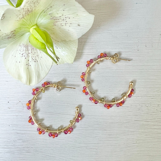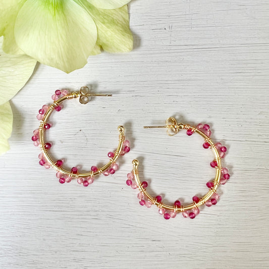 Fuchsia Pink & Candy Pink Garnet Swirl Midi Hoop Beaded Earrings