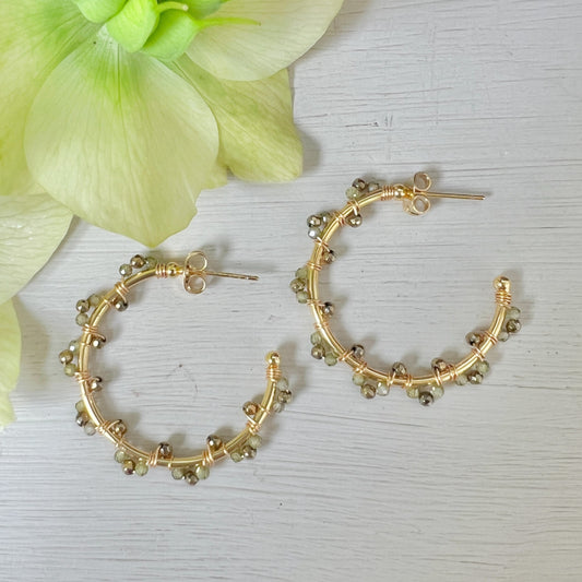 Olive Green Peridot & Pyrite Swirl Midi Hoop Beaded Earrings