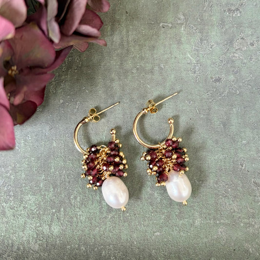 Mini Hoop Earrings With Ibiza Pearl & Burgundy Garnet Drops
