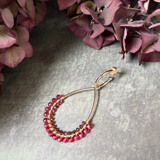 Fuchsia Pink & Burgundy Garnet 1/2 Teardrop Earrings On Hoops