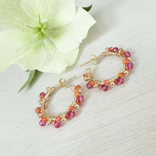 Fuchsia Pink Garnet & Orange Carnelian Mini Bobble Hoop Beaded Earrings