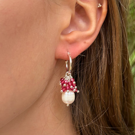 Mini Hoop Earrings With Ibiza Pearl & Fuchsia Pink Garnet Drops (Silver)