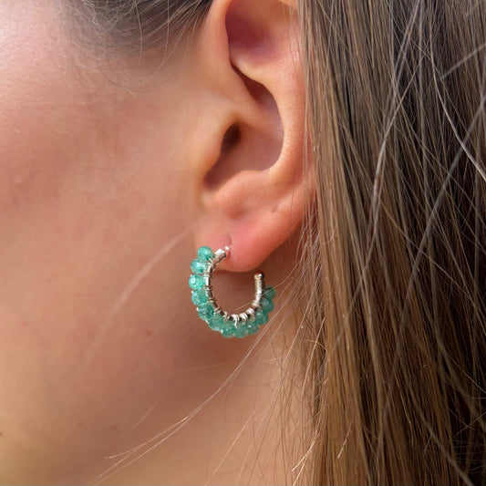 Chunky Mid Emerald Green Jade Mini Hoop Beaded Earrings (Silver)
