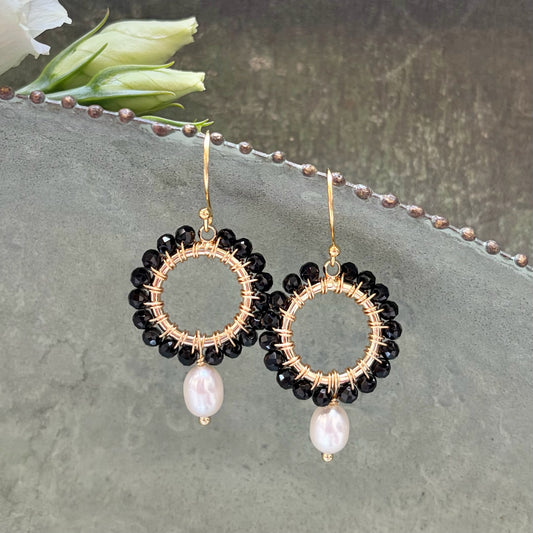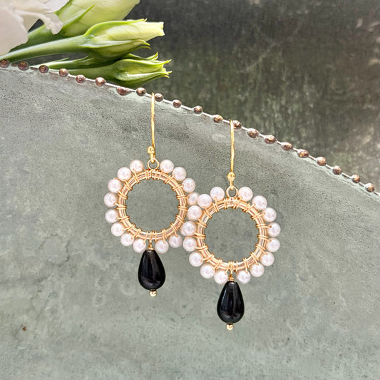 Pearl Mini Round With Black Onyx Drop Beaded Earrings