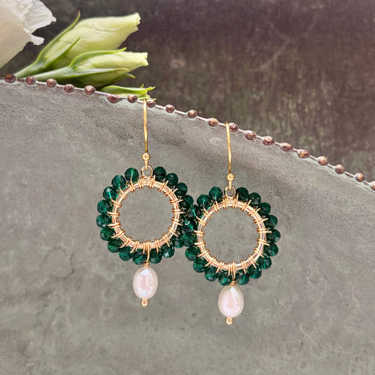 Emerald Green Jade Mini Round With Pearl Drop Beaded Earrings