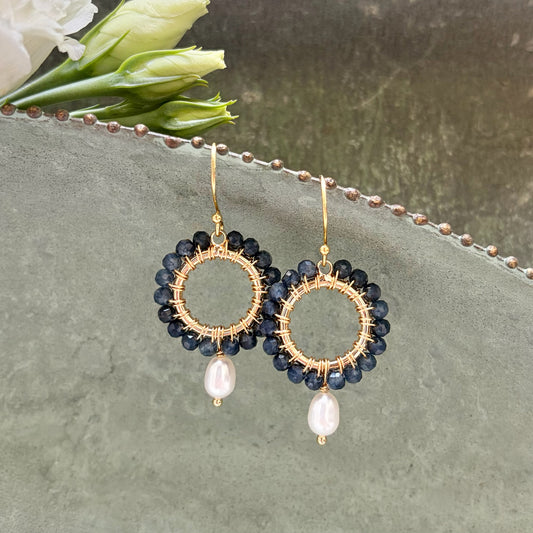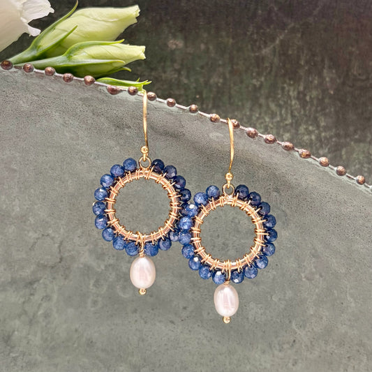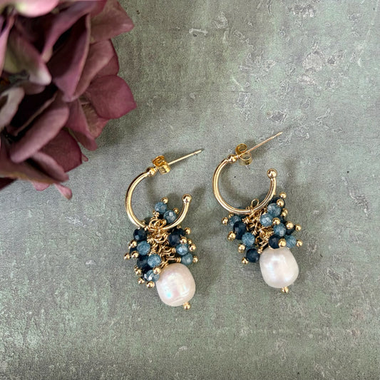 Mini Hoop Earrings With Ibiza Pearl & Dark Denim Blue Iolite Drops