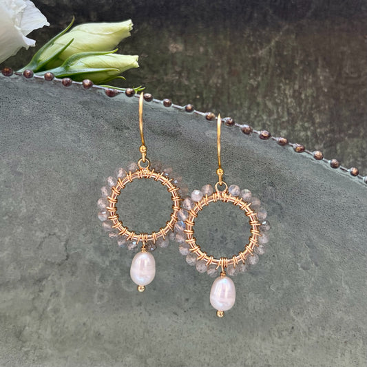 Grey Labradorite Mini Round With Pearl Drop Beaded Earrings