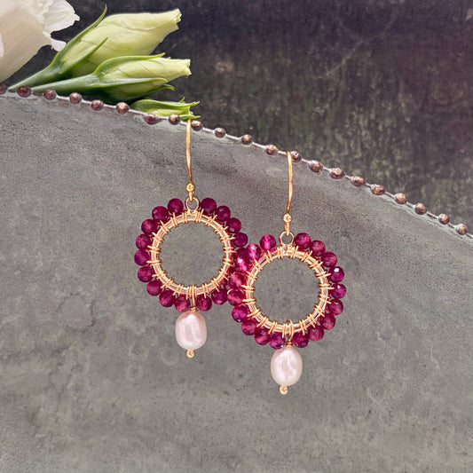 Mini Hoop Earrings With Ibiza Pearl & Burgundy Garnet Drops