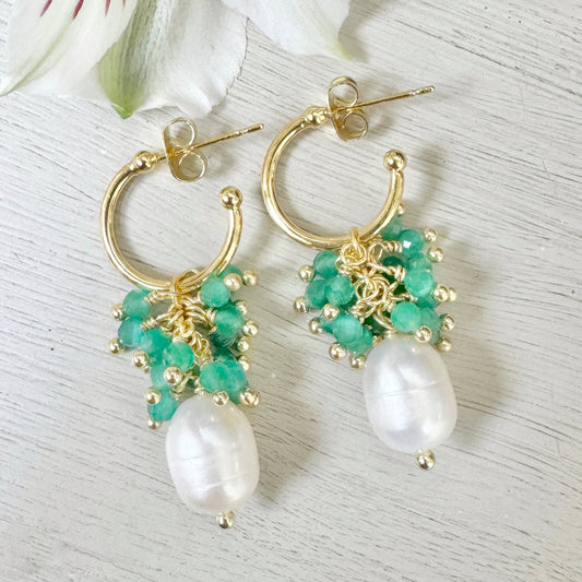 Mini Hoop Earrings With Ibiza Pearl & Dark Mint Green Jade Drops