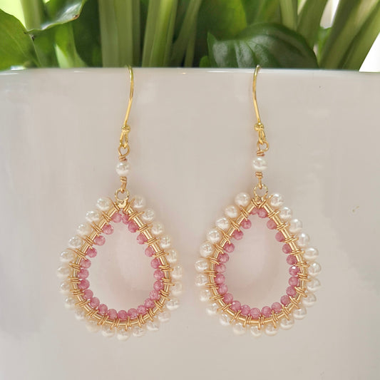 Freshwater Pearl & Dusky Pink Garnet Double Beaded Midi Teardrop Earrings