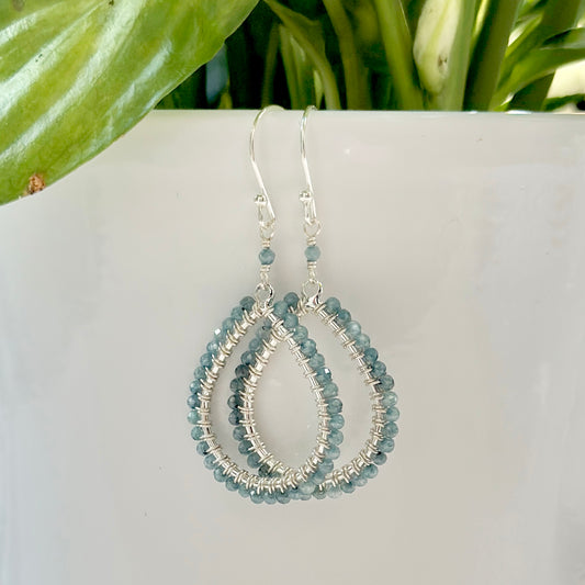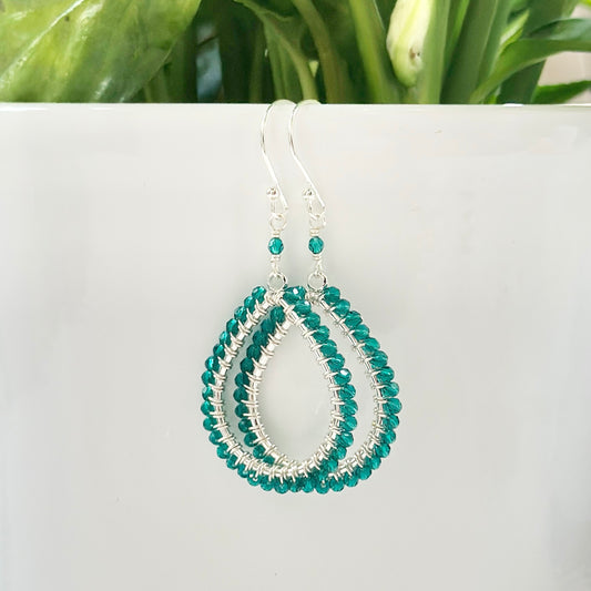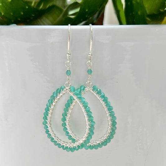 Teal Green Quartz Midi Teardrop Beaded Earrings (Silver)