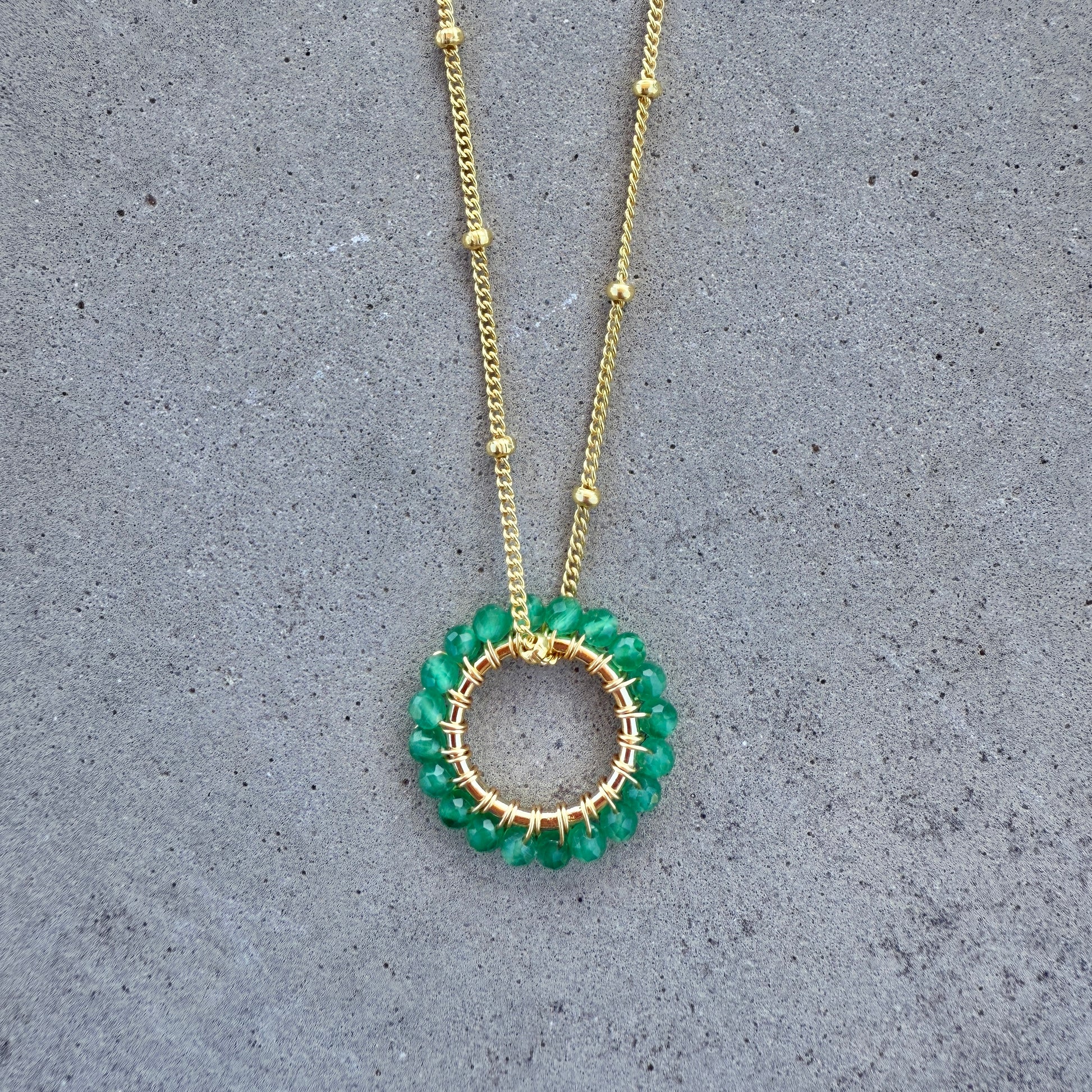 Pendants are handcrafted using semi-precious stones wrapped on 14ct gold vermeil circles. Hypoallergenic.