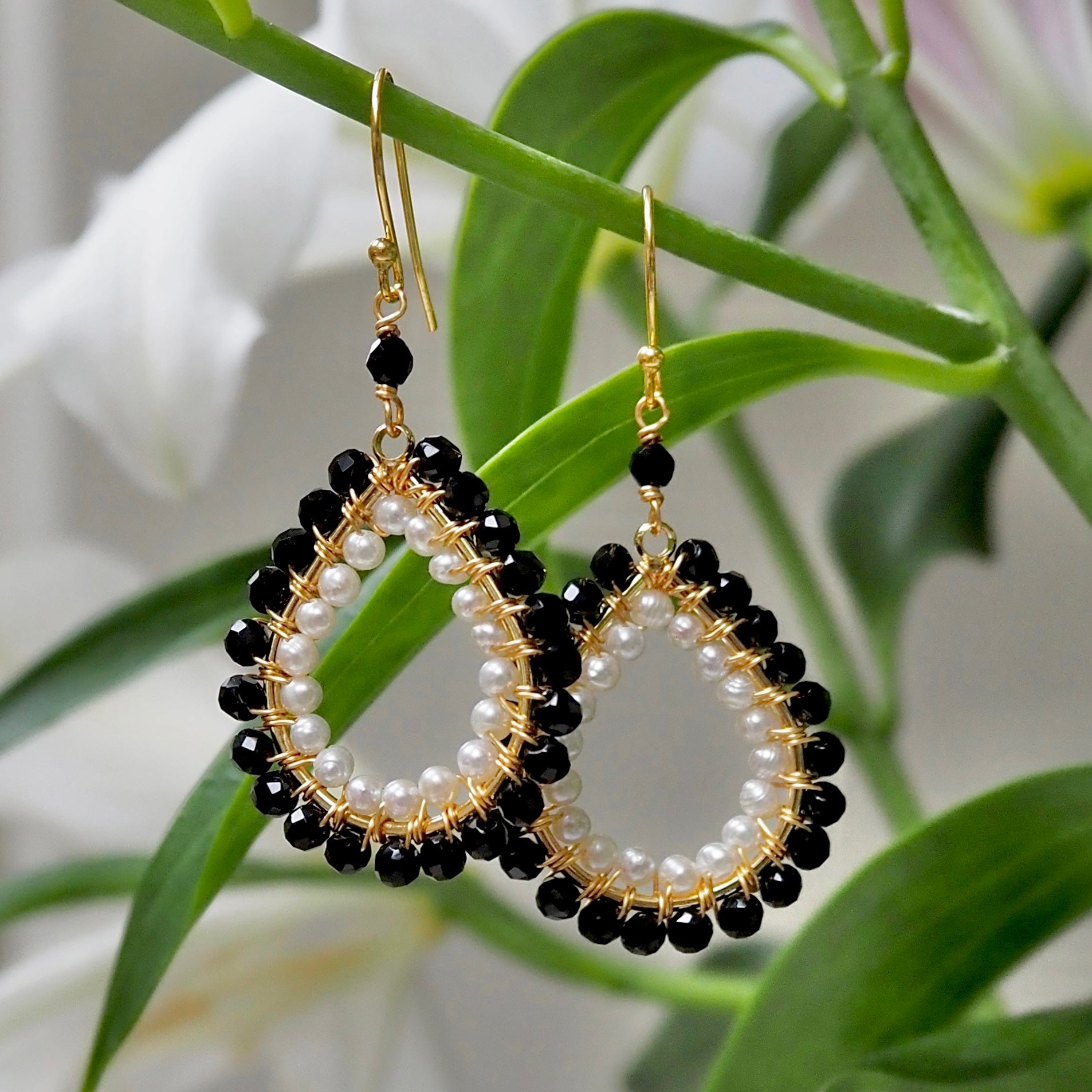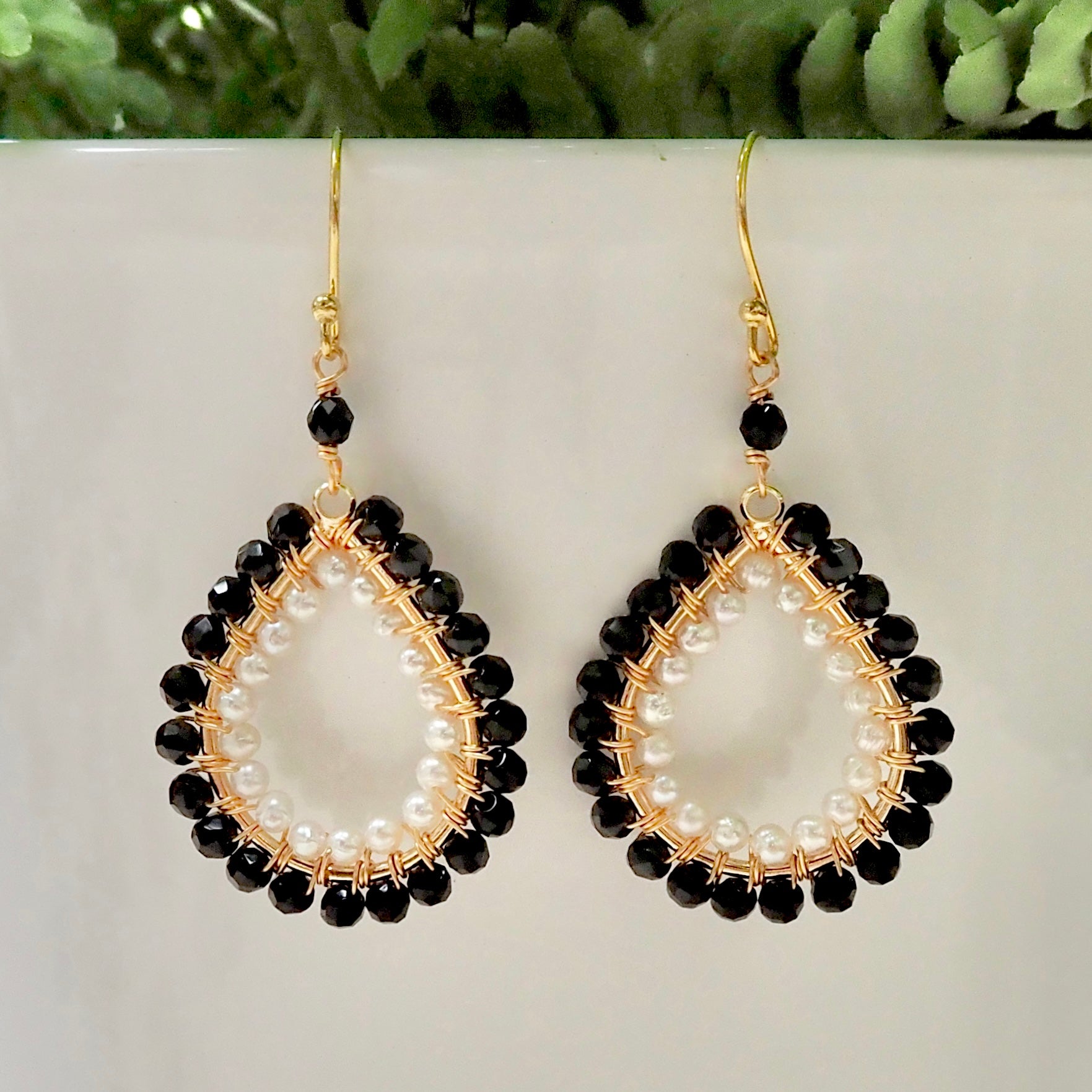 *Black Onyx & Freshwater Pearl Double Beaded Midi Teardrop Earrings