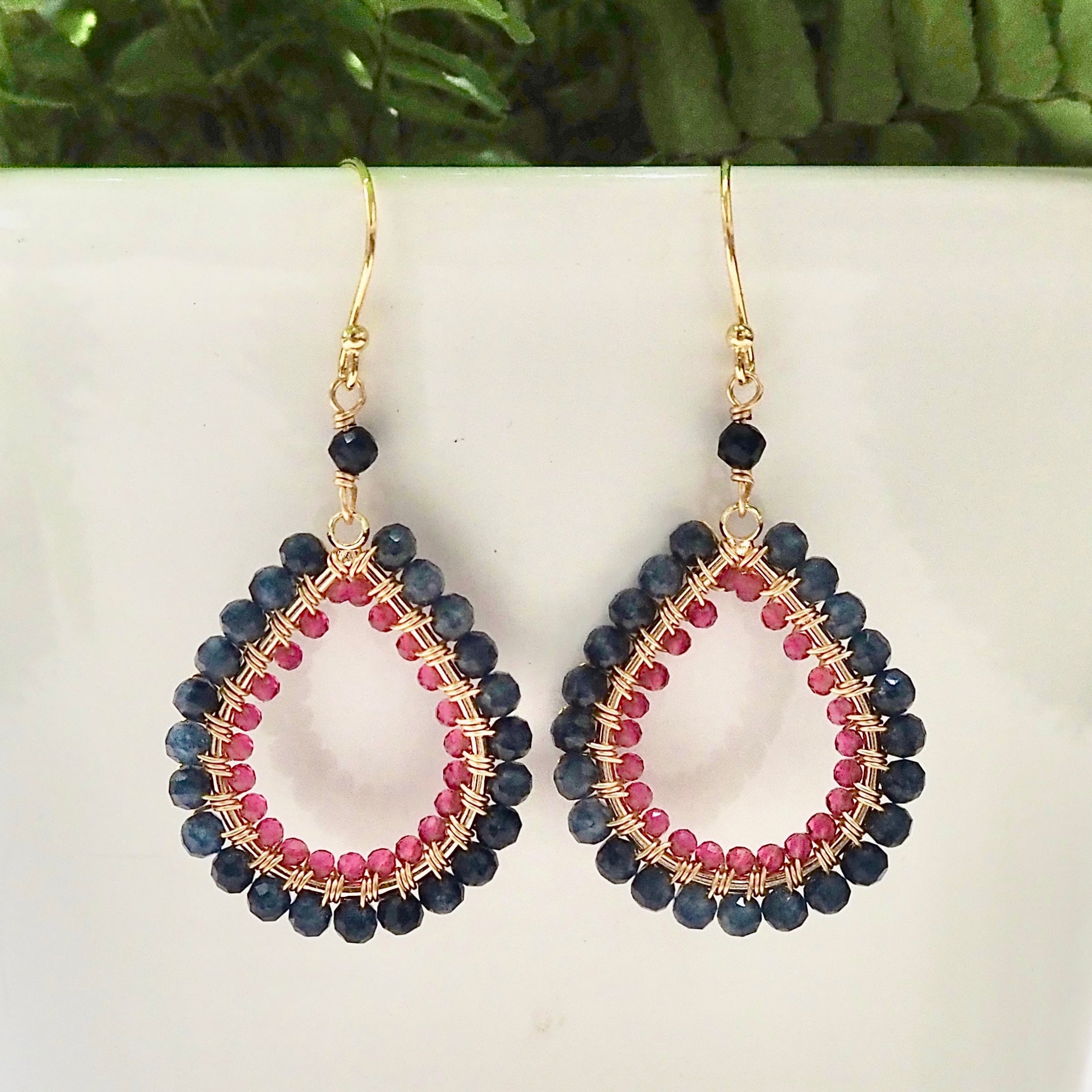 *Dark Denim Iolite & Fuchsia Pink Garnet Double Beaded Midi Teardrop Earrings
