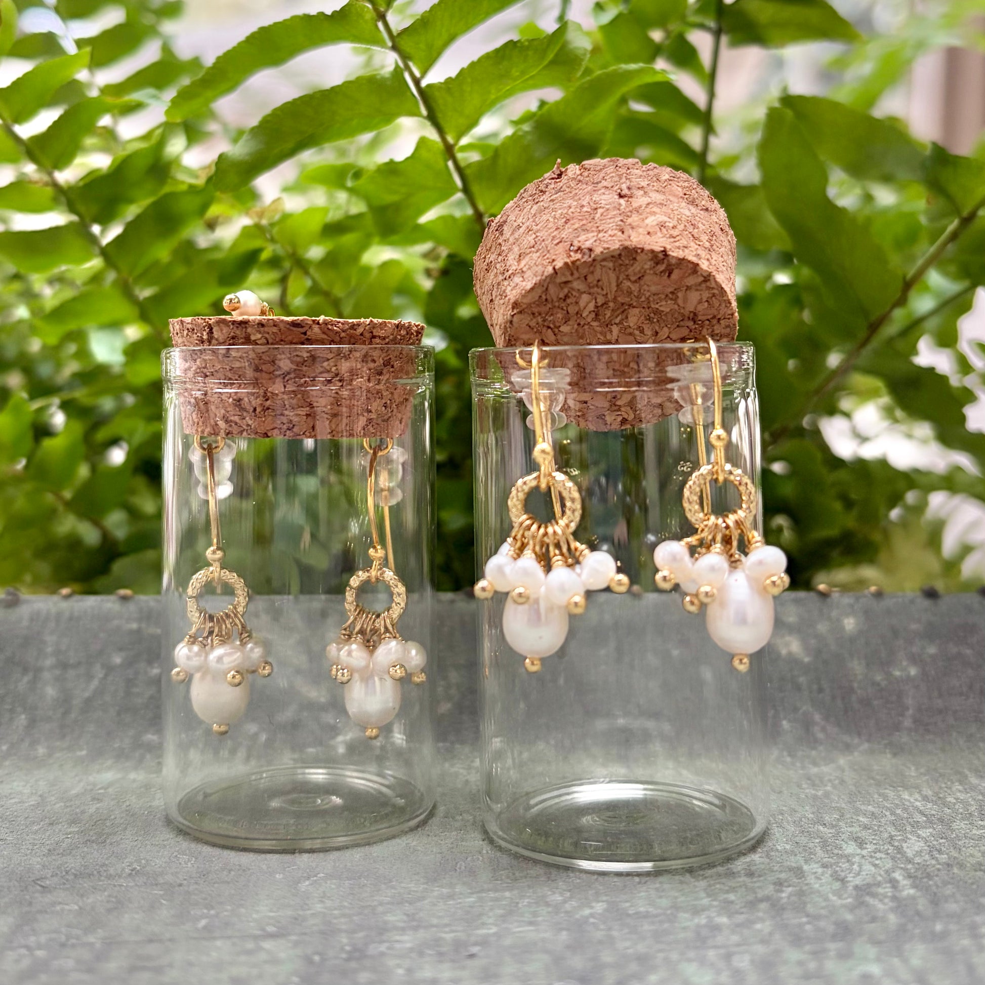 Handcrafted using freshwater pearls on gold vermeil mini rings. Ear pins are 925 sterling silver with 14k gold plate. Hypoallergenic.