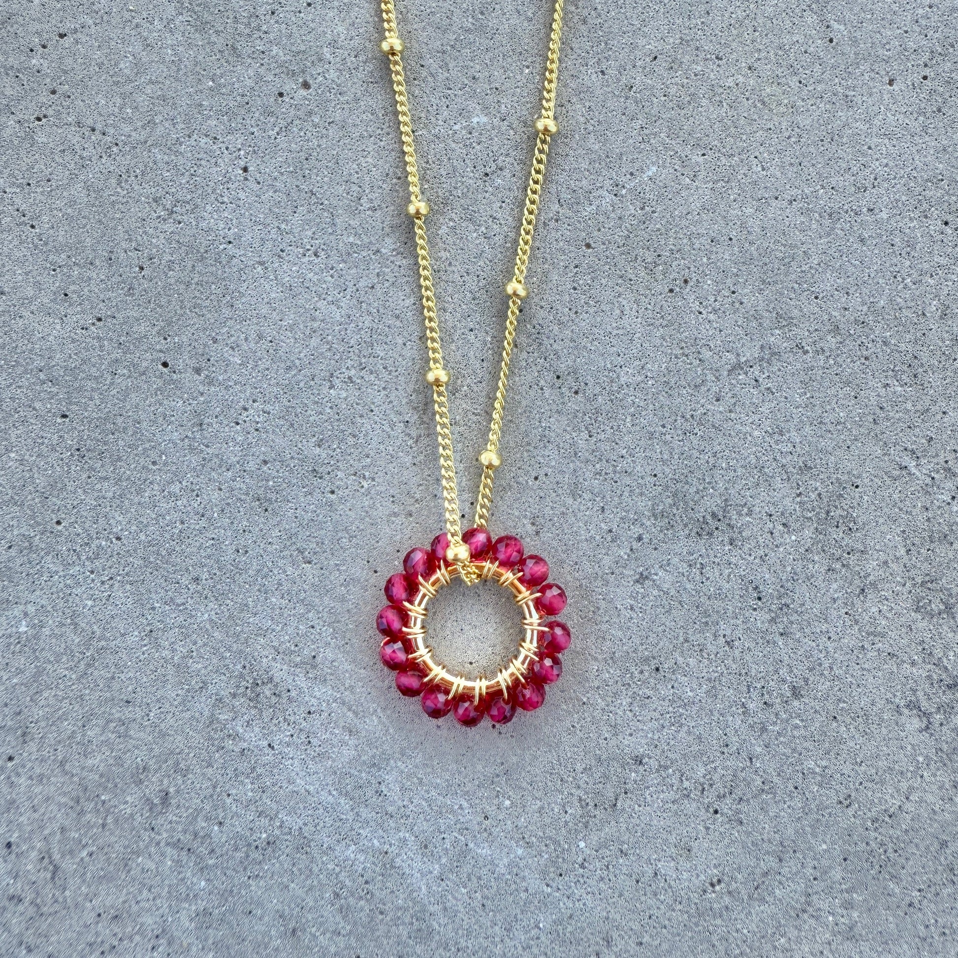 Pendants are handcrafted using semi-precious stones wrapped on 14ct gold vermeil circles. Hypoallergenic.