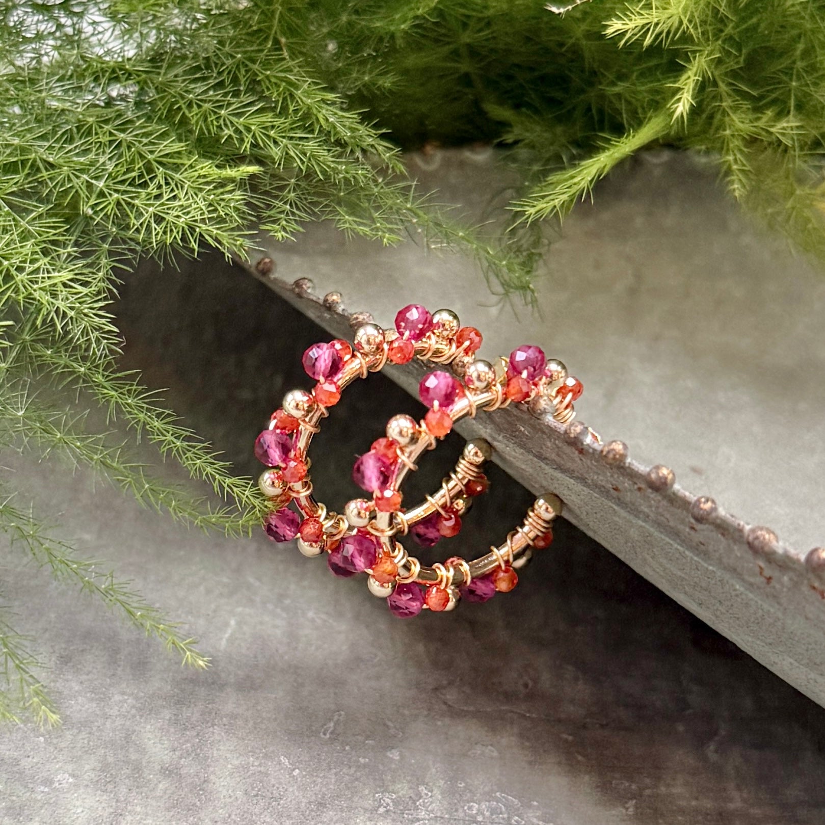 Fuchsia Pink Garnet & Orange Carnelian Mini Bobble Hoop Beaded Earrings