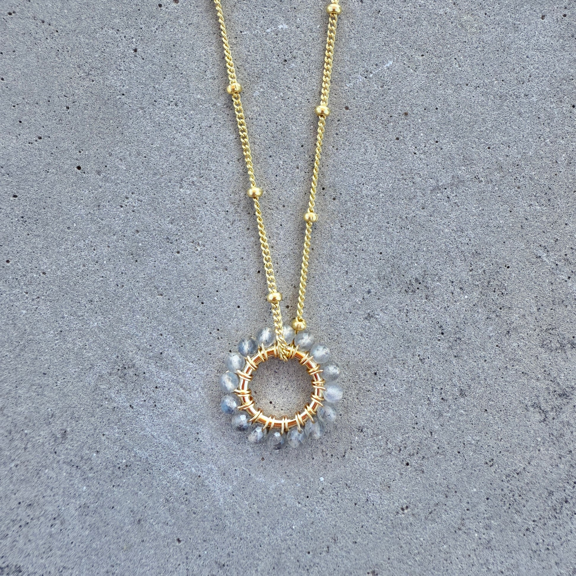 Pendants are handcrafted using semi-precious stones wrapped on 14ct gold vermeil circles. Hypoallergenic.