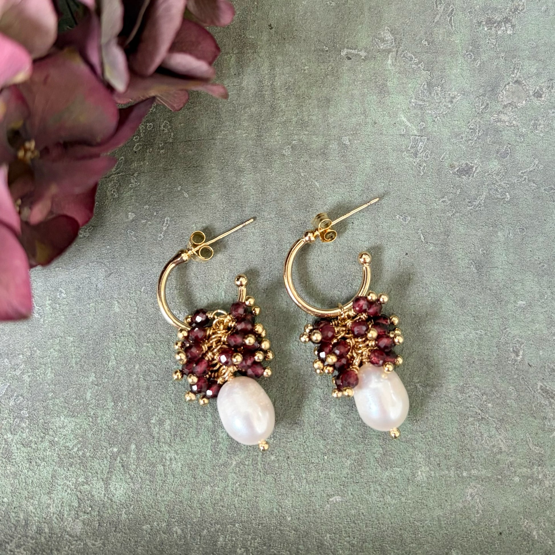 *Mini Hoop Earrings With Ibiza Pearl & Burgundy Garnet Drops
