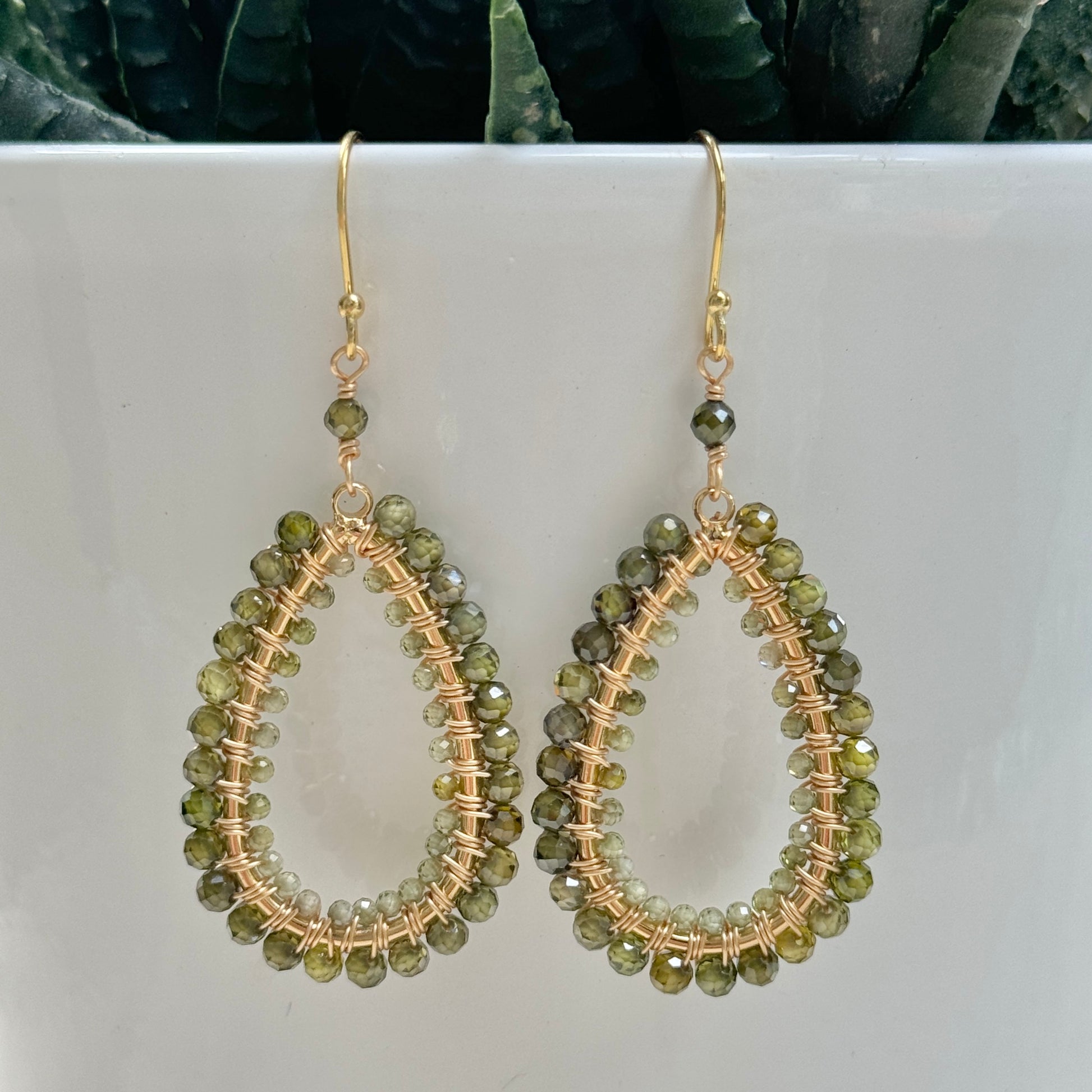 Olive Green Peridot Double Beaded Long Teardrop Earrings