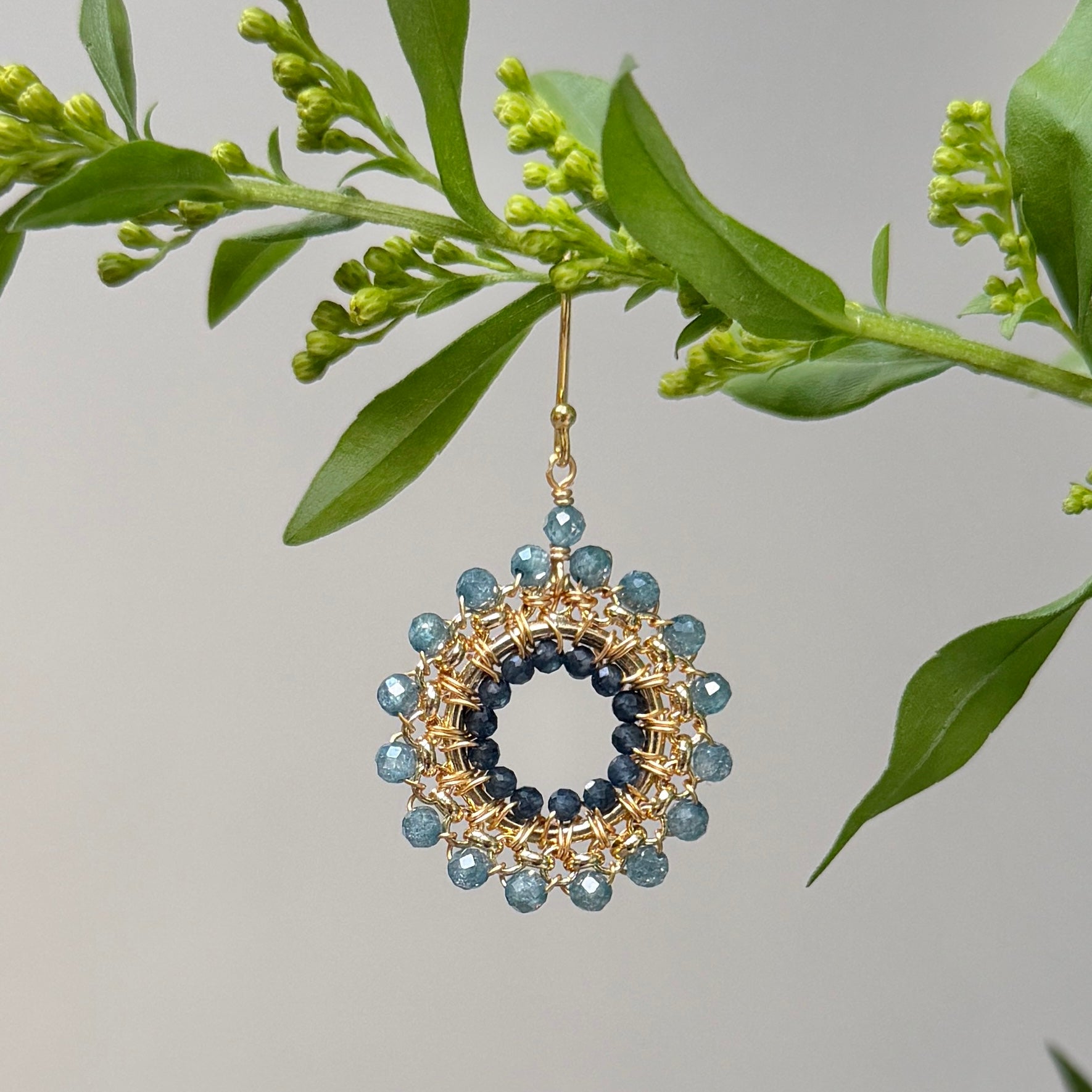 Handcrafted using semi-precious crystals/stones intertwined on a gold plated rolo chain on circle shape. Hooks are 925 sterling silver with 14ct gold plating. Hypoallergenic.